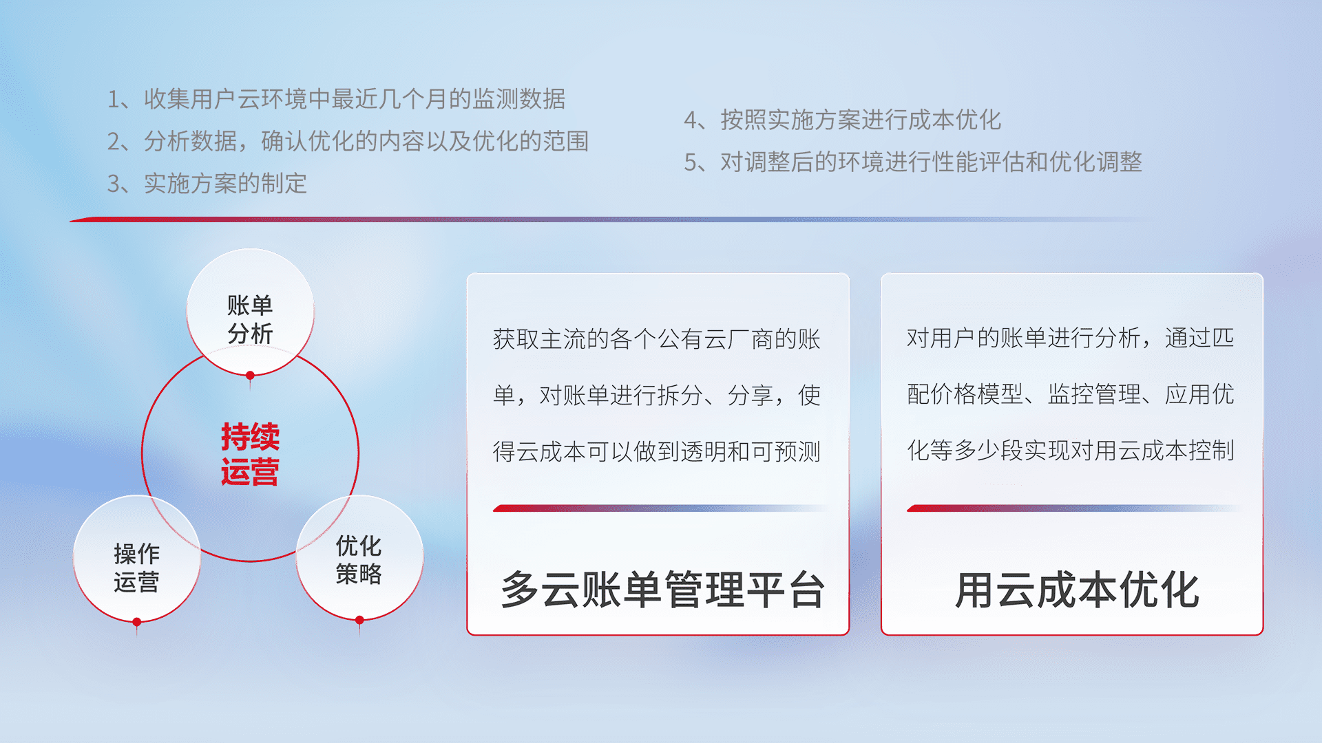 通过多云纳管,,,,以统一的资源数据模型把客户的云资源进行抽象和封装,,进而实现对多云资源的统一操作,,保障云资源管理的可靠性、、、稳定性与可用性。。。量身定制化运维内容,,,,配置、、、、开发运维、、补丁管理、、、、备份、、、、监控、、认证和访问管理、、、审计和日常巡检等,,保障在用云过程中的可靠度,,,,稳定度以及高可用率。。。。